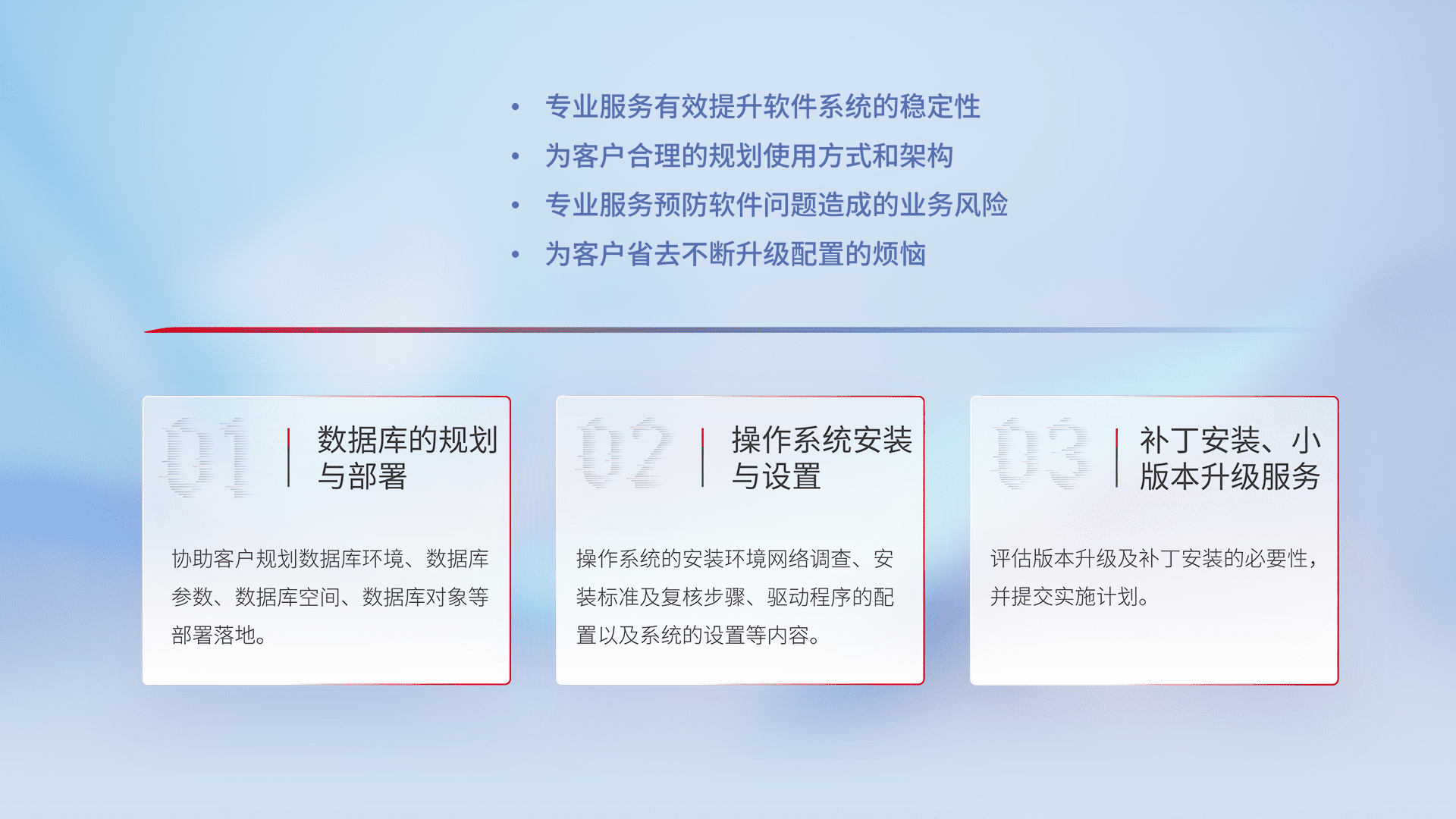 为客户提供软件规模升级、、快速部署、、按需配置的专业服务,,,从数据库的规划与部署到操作系统的安装与设置,,,再到补丁安装和小版本升级提供支持。。